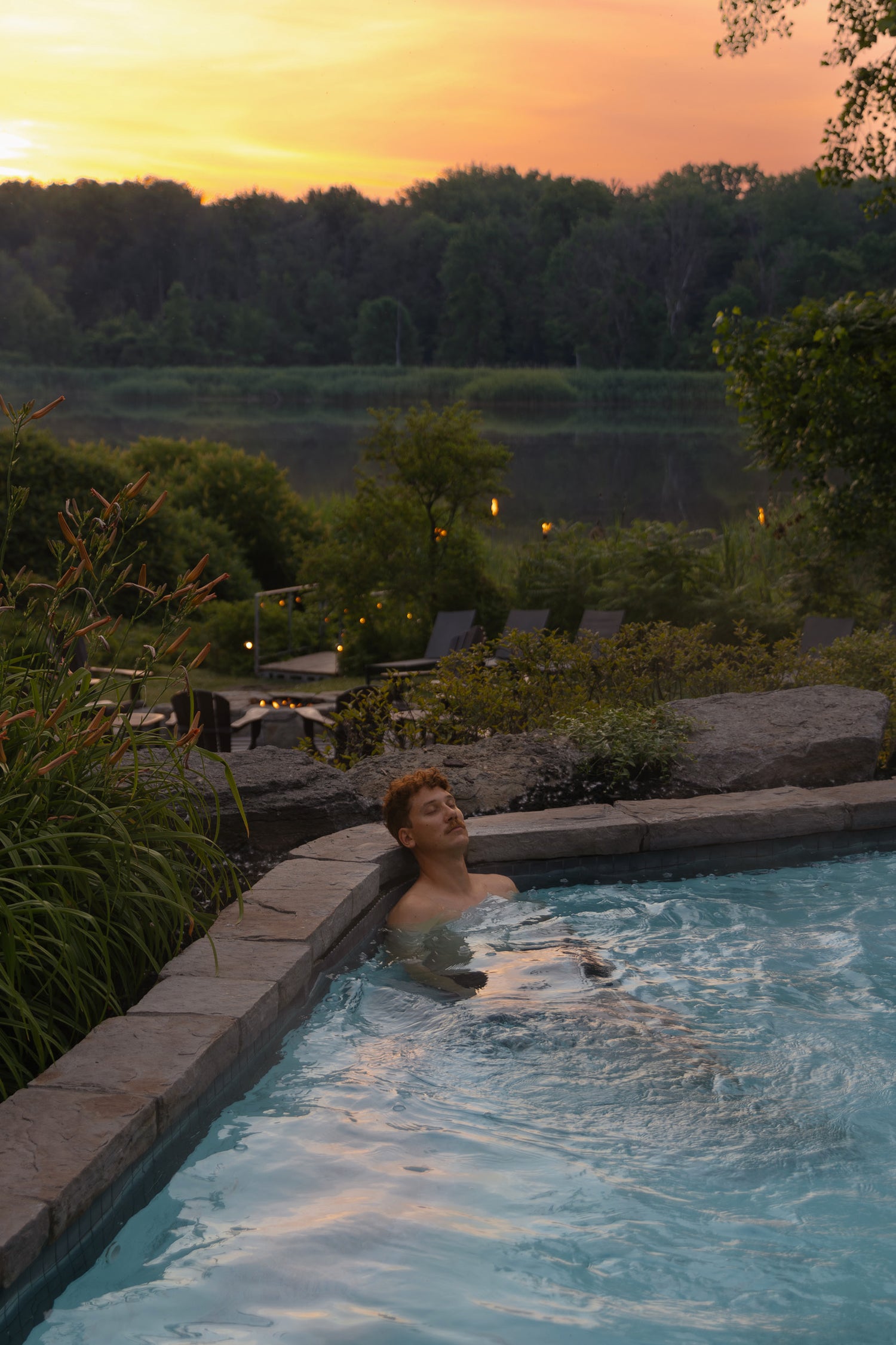 Telle une fleur qui n'éclot qu'une fois l'automne venu, la station thermale des Laurentides est finalement dévoilée. Dans la rivière à Simon, majestueuse et invitante, se reflètent les rayons dorés si caractéristiques de cette saison de transition, alorsque les arbres enveloppants qui ceignent le lieu se parent de leurs couleurs chaudes.