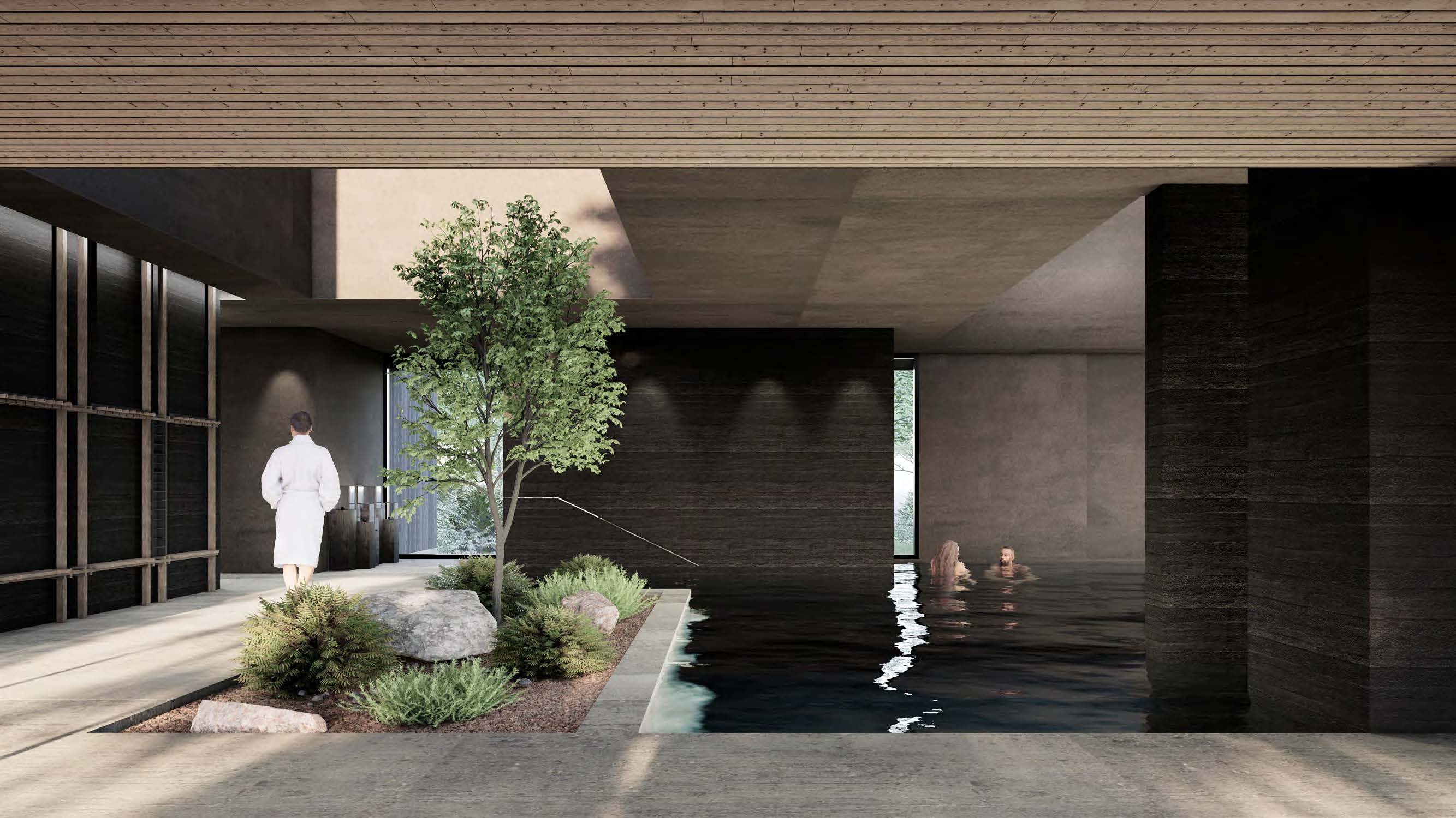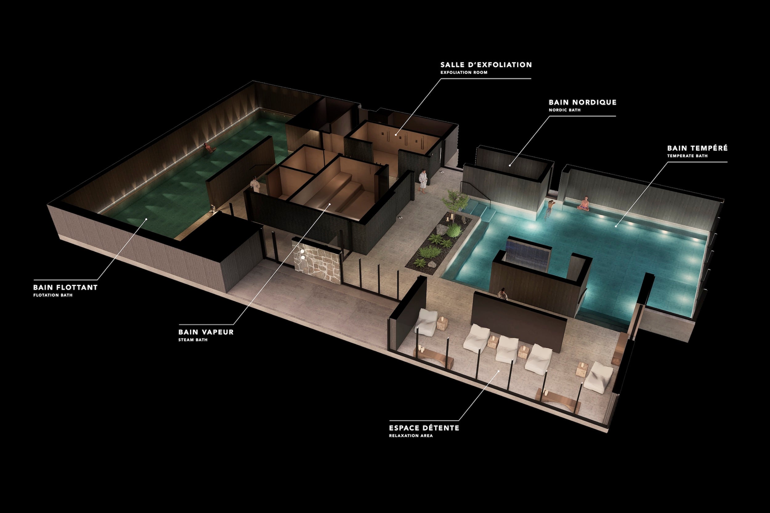 Outdoors, additional relaxation areas, a two-level thermal bath, and a thermal river inspired by a lazy river will further elevate this moment of rejuvenation.