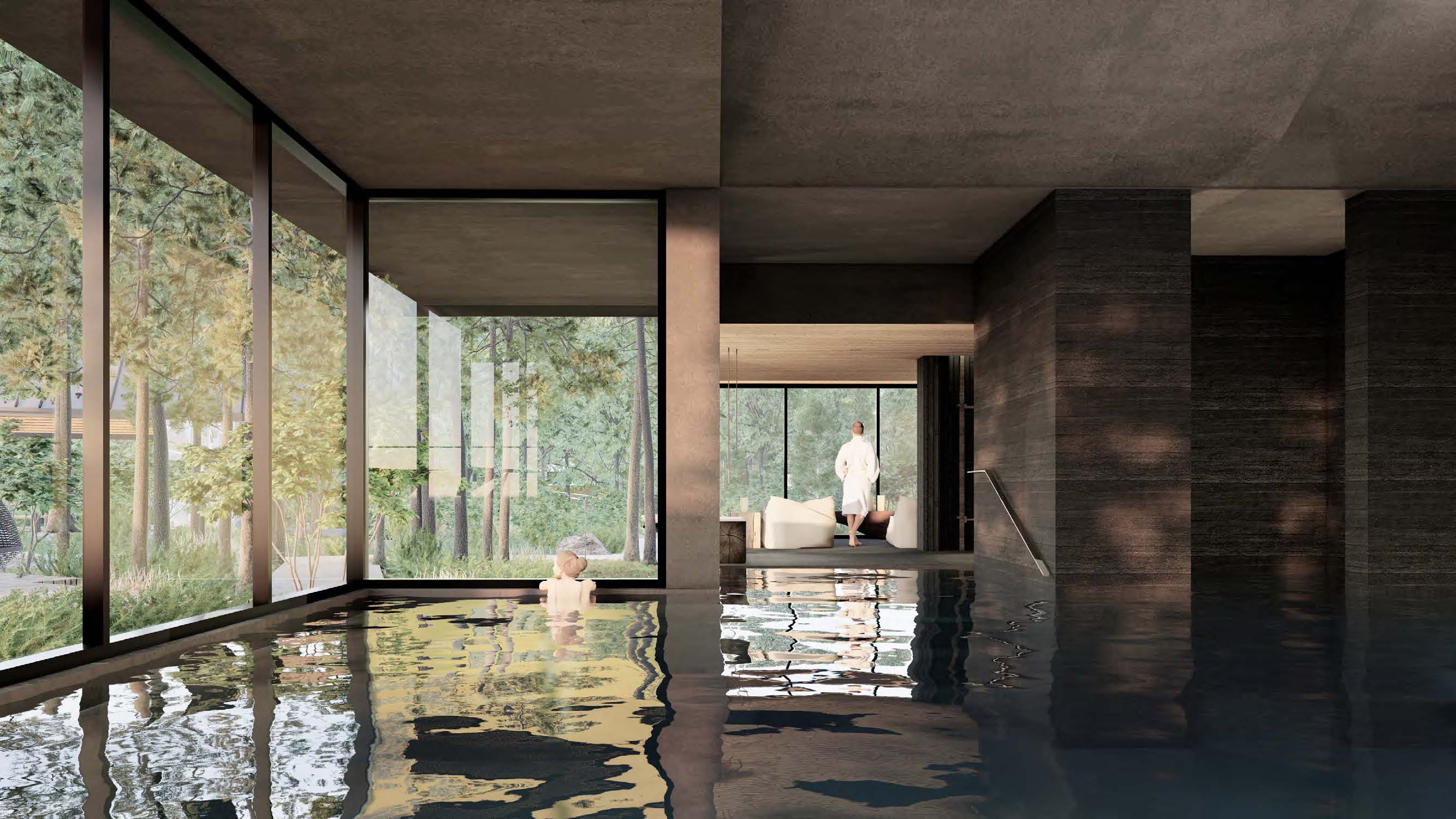 The indoor pavilion features all the facilities needed to complete a thermal cycle sheltered from the elements: Thermal bath, Nordic bath, steam bath, flotation bath, exfoliation room, and relaxation area. At the heart of these spaces lies a carefully designed indoor garden, serving as a gentle reminder of the natural setting that surrounds the thermal station.