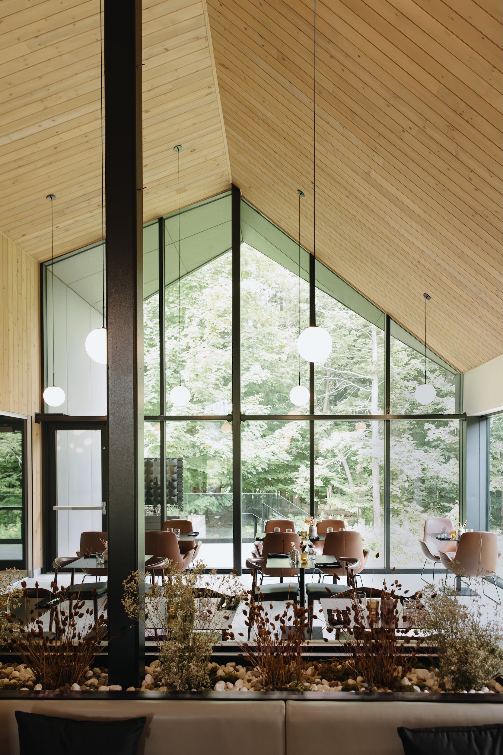 Traversé par la rivière à Simon, le Strøm spa nordique Saint-Sauveur honore la tradition scandinave déjà bien implantée dans les Laurentides en se déployant sur le site du premier spa nordique au Québec, inauguré dans les années 1960. La proximité du bâti et du cours d’eau est ce qui fait la force de cette station thermale, alors que l’on passe facilement de la chaleur du sauna à la fraîcheur de la rivière.