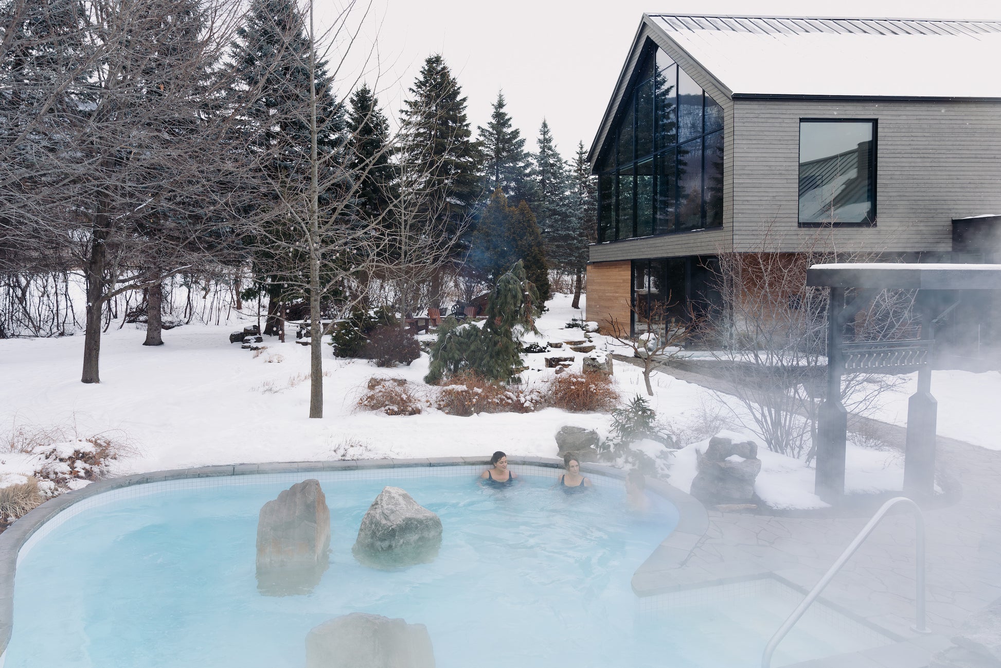 Les installations comprennent des bains à remous en plein air, des bains tempérés et glacés, des saunas finlandais, un bain de vapeur à l’eucalyptus, des chutes thermale et nordique et plusieurs aires de détente intérieures et extérieures avec foyers.