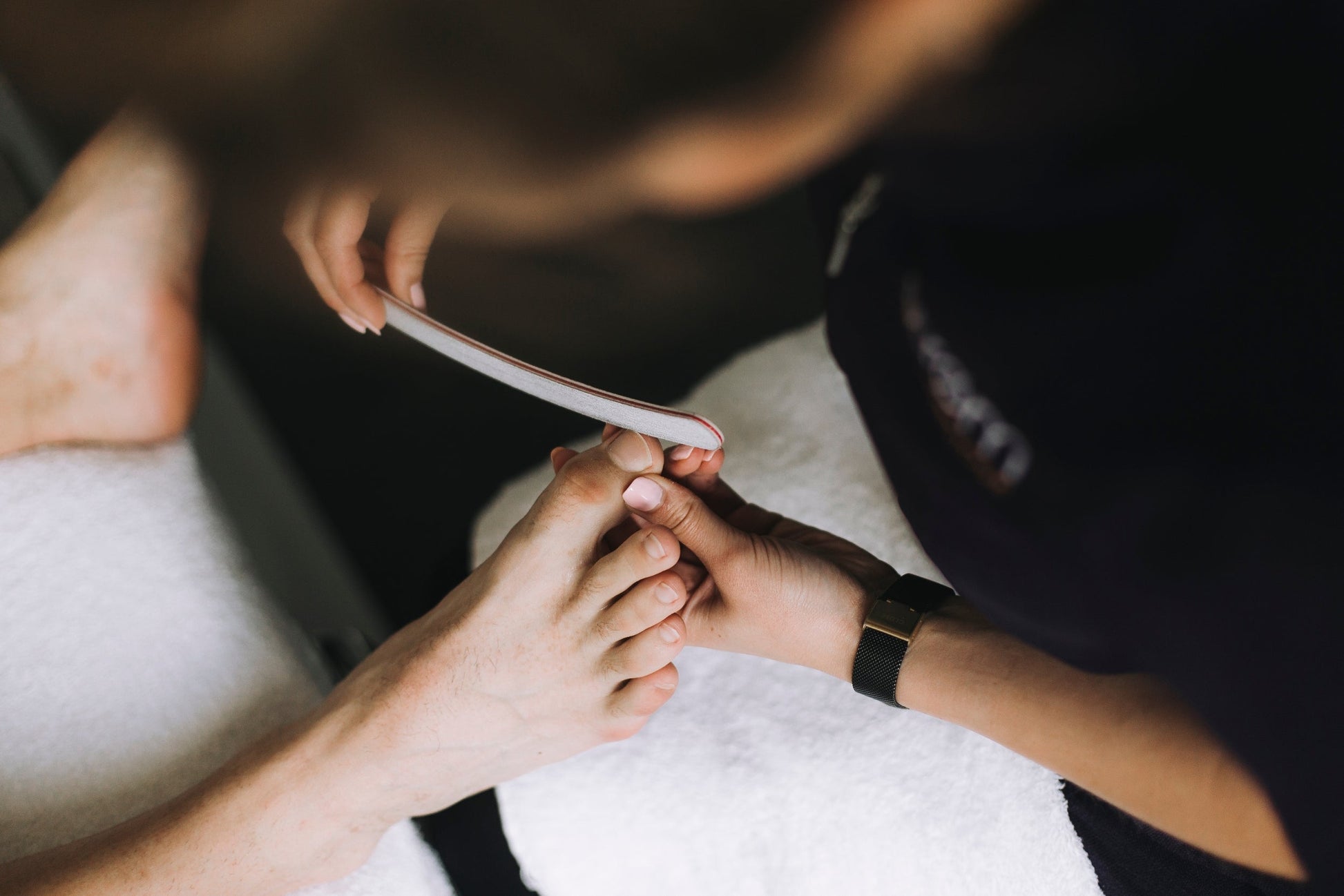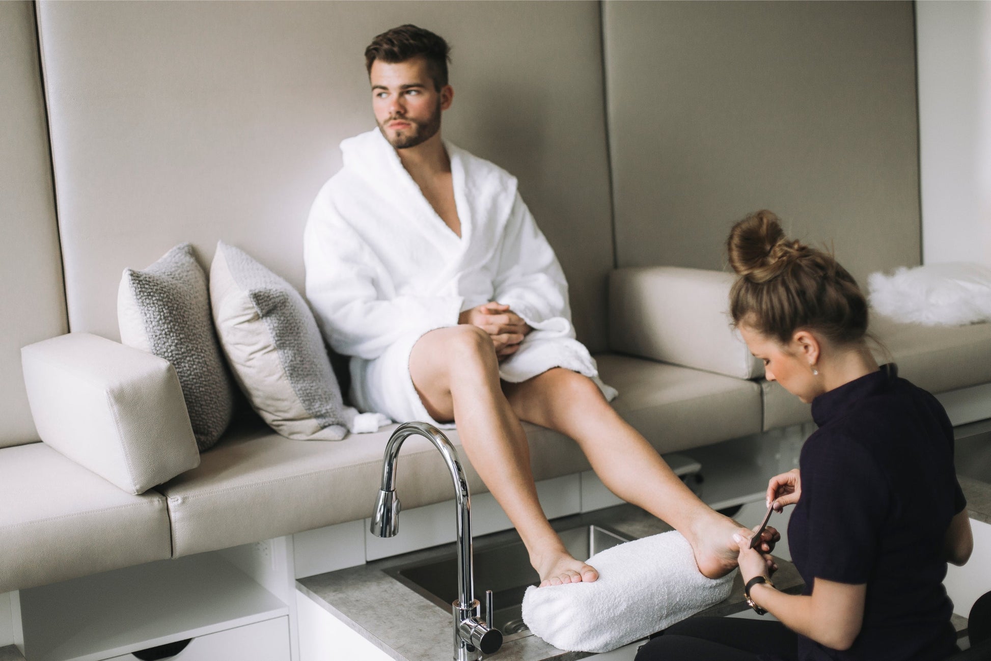 Conçu dans le but de redonner aux pieds toute leur douceur, ce soin comprend le trempage, la préparation des ongles (retrait de vernis au besoin), le soin des cuticules, l’adoucissement des callosités et l’exfoliation (gommage). Le tout est suivi d’un massage des pieds et des mollets avec une crème et se termine par un enveloppement hydratant des pieds.